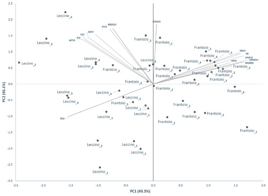 The results obtained in this study demonstrate the possibility to discriminate between two olive scions applying a multivariate approach to the elaboration of VI data. Relevant differences in index sensitivity emerged; however, the multivariate statistical approach contributed to compensating for the limits of each index, while stating the effectiveness of a limited set of indices (NDVI and DVI) to reach the same discriminant accuracy reported for the whole set of calculated VIs. Further efforts should be addressed to test our results on a wider range of cultivars, as well as in different environmental and agronomic conditions.