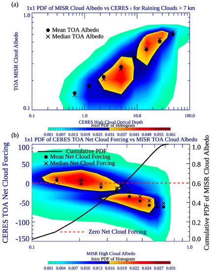 (a) Joint PDF of 1° × 1° TOA cloud albedo versus CERES high cloud optical depth τ for raining clouds (as defined by collocated TRMM grids) for grids in which the MISR cloud fraction > 0.2 above 7 km, and the high-topped cloud fraction>low-topped cloud fraction. Mean and median values are shown for each bin. (b) Same as (a), except joint PDF of CERES net cloud forcing versus MISR high cloud albedo. The red dashed line denotes zero net cloud forcing, and the black line depicts the cumulative PDF.