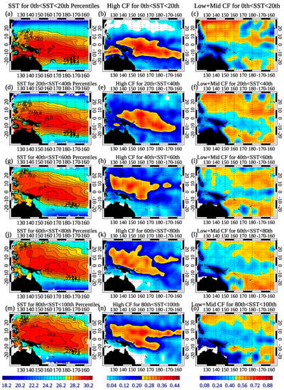As SSTTWP increases, the total north-south extent of the warm pool, e.g., the SST contour > ~27 °C, increases, as does the size of maximum SST area, but the maximum SST value near the equator does not increase. Instead, for any of the five SST states, the axis of highest SSTs tends to be oriented from northwest to southeast. This is similar to the contours of high cloud fraction (middle column). For the lowest SSTTWP, very low values of high CF, e.g., CF < 0.04, are in the northernmost part of the domain—e.g., the white area (Figure 2b)—but the white area diminishes to nearly zero in the second and third rows. Then, high clouds become scarce in the southwestern part of the domain, just north of Australia, for the second warmest and warmest TWP regimes, as the warm pool expands further north rather than south. There is no a clear expansion or contraction of high cloud area with SSTTWP, but there is a much more clear and robust decrease of low+mid CF with increasing SSTTWP (right column), as more clouds transition from low or middle modes to deep modes with a broader area of higher SSTs. Furthermore, the size of the coolest SST area, where low clouds are most abundant, decreases with increasing TWP SST quintile.