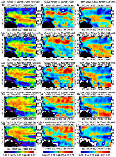 (a) Fraction of raining grids, (b) cirrus fraction of total high cloud fraction, and (c) TOA cloud albedo during times when the mean TWP SST is in the first SST quintile (26.70 °C < SSTTWP < 27.09 °C). (d–f): Same as (a–c), except during times when the mean TWP SST is in the second SST quintile (27.09 °C < SSTTWP < 27.29 °C). (g–i): Same as (d–f), except during times when the mean TWP SST is in the third quintile (27.29 °C < SSTTWP < 27.41 °C). (j–l): Same as (g–i), except during times when the mean TWP SST is in the fourth quintile (27.41 °C < SSTTWP < 27.51 °C). (m–o): Same as (j–l), except during times when the mean TWP is in the fifth quintile (27.51 °C < SSTTWP < 27.88 °C). The MISR cloud properties in the middle and right columns are conditional for daily raining grids only.