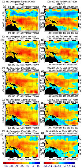 (a) ω500 (mb/day) and (b) divergence at 850 hPa (Div850) (1 × 106s−1) during times when the mean TWP SST is in the first quintile (26.70 °C < SSTTWP < 27.09 °C). (c,d): Same as (a,b), except during times when the mean TWP SST is in the second quintile (27.09 °C < SSTTWP < 27.29 °C). (e,f): Same as (c,d), except during times when the mean TWP SST is in the third quintile (27.29 °C < SSTTWP < 27.41 °C). (g,h): Same as (e,f), except during times when the mean TWP SST is in the fourth quintile (27.41 °C < SSTTWP < 27.51 °C). (i,j): Same as (g,h), except during times when the mean TWP SST is in the fifth quintile (27.51 °C < SSTTWP < 27.88 °C). All panels are conditional for daily raining grids only.