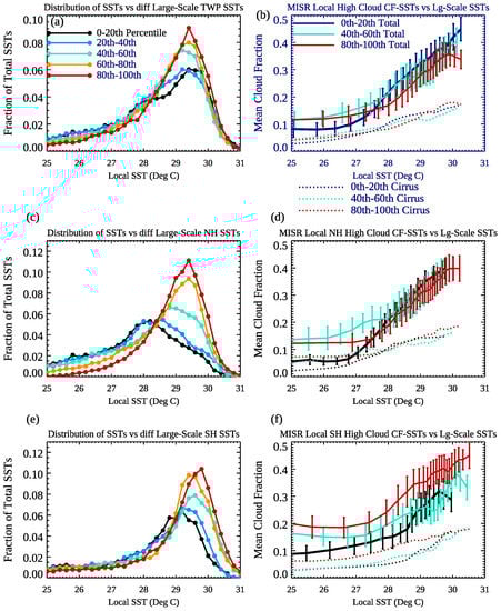 (a) Distribution of local SSTs over the TWP for raining grids as a function of the TWP SST quintiles in Figure 2 and as described in the text. (b) MISR total high cloud fraction versus local SST for raining grids as a function of the first, third, and fifth TWP SST quintiles, along with standard error bars showing the 90% confidence intervals. Dashed lines are for cirrus cloud fraction only. (c) Same as (a), except for SSTs as a function of SST quintiles in the northern hemisphere only. (d) Same as (b), except for clouds in the northern hemisphere TWP portion only. (e) and (f) are the same as (c) and (d), respectively, except for the southern hemispheric portion of the TWP.