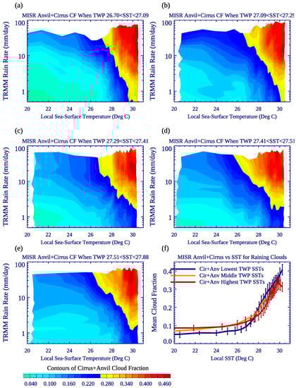 (a–e): Contours of anvil+cirrus cloud fraction as a function of local TRMM rain rate and local SST for each of the five TWP SST quintiles. Each panel has 25 rain rate by 25 SST categories. (f) Cirrus+anvil CF versus local SST for the lowest, middle, and highest TWP SST quintiles, averaged over all rain rates. Thick dashed lines depict cirrus CF only. In (f), standard error bars for the highest and lowest TWP SST quintiles represent the 90% confidence interval.