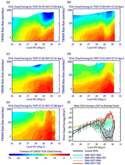 (a–e): Contours of TOA cloud forcing as a function of local TRMM rain rate and local SST for each of the five TWP SST quintiles, for (a) first mean TWP SST quintile, (b) second TWP SST quintile, (c) third TWP SST quintile, (d) fourth TWP SST quintile, and (e) fifth TWP SST quintile. (f) TOA Forcing versus local SST averaged over all rain rates, with standard error bars showing the 90% confidence interval for the lowest, middle, and highest TWP SST quintiles.