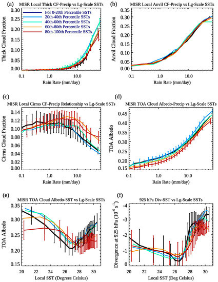 (a) MISR local thick CF vs. local rain rate for all five TWP SST quintiles. (b) Same as (a), except for anvil CF. (c) Same as (a) and (b), except for cirrus CF. (d) MISR TOA albedo versus local rain rate. (e) MISR TOA albedo versus local SST. (f) 925 hPa Divergence (× 10−6 s−1) vs. local SST. Note that the rain rate axis on (a–d) is a logarithmic scale. 90% confidence intervals are shown in panels (a,c–f).