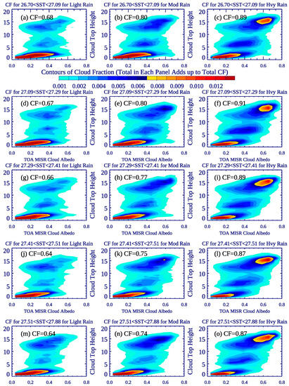 Z-albedo histograms of MISR CF for all five TWP SST quintiles for light, moderate, and heavy rain cloud systems. (a–c) Histograms when the mean TWP SST is in the first quintile (26.70 °C < SSTTWP < 27.09 °C) for (a) light, (b) moderate, and (c) heavy rain cloud systems. (d–f) Same as (a–c), except when mean TWP SST is in the second quintile (27.09 °C < SSTTWP < 27.29 °C). (g–i) Same as (d–f), except when the mean TWP SST is in the third quintile (27.29 °C < SSTTWP < 27.41 °C). (j–l) Same as (g–i), except when the mean TWP SST is in the fourth quintile (27.41°C < SSTTWP < 27.51 °C). (m–o): Same as (g–i), except when the mean TWP SST is in the fifth quintile (27.51 °C < SSTTWP < 27.88 °C). Total cloud fraction is given in each panel.