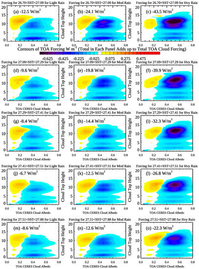 In Figure 7, each of the five contour panels from (a)–(e) span the five TWP SST quintiles, but now TOA Net Cloud Forcing is shown from CERES. The trend of TOA Net Cloud Forcing is quite clear—as the mean SSTTWP increases, the TOA forcing over the rainiest, most intense convection between ~29–30 °C becomes substantially less negative. In other words, over high local SSTs, the net cooling effects of deep convection reduce as the entire domain warms. We will explore height-albedo (Z-αcloud) histograms of cloud fraction and TOA cloud forcing later to better relate the vertical structure of clouds and their reflectivity for lightly, moderately, and heavily precipitating clouds. For now, this sharp increase of TOA net forcing over the highest local SSTs when the domain is warmer in general is a positive regional feedback that warrants attention.