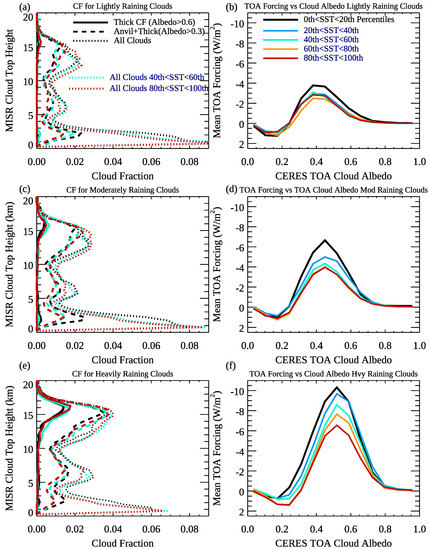 Results from Figure 10 and Figure 11 are summarized as profiles in the left column of Figure 12, and as a function of TOA albedo on the right column. The left column shows cloud fraction as a function of height for thick (solid), thick+anvil (thick dashed), and all clouds (thin dashed) for the 0th–20th TWP SST percentiles, 40th < SST < 60th TWP SST percentiles, and 80th < SST < 100th percentiles. As from before, total high cloud increases with rain rates, with a greater portion of particularly mid-level clouds when the TWP domain is cooler. The anvil cloud height mode is also slightly lower (~500 m) for moderately or lightly raining clouds for the highest versus the lowest TWP SST quintile. The mode of thick cloud top heights, however, is around 16 km regardless of SST or rain rate, consistent with these clouds being the most undiluted, and with Chae and Sherwood [33], who used MISR Level-2 cloud height data in a partially overlapping region with ours.