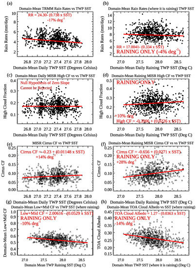 Finally, we show domain-mean mid+low level cloud fraction versus TWP SST for raining grids only, with a substantial decrease per degree of SST (−0.0529 deg−1). This result is qualitatively consistent with the findings from Rapp et al. [29]. This suggests that cloud fraction does indeed aggregate with increasing SST, but not high clouds as has been previously reported, but instead clouds below 9 km. Indeed, the lower-level cloud signal dominates the total CF decrease with TWP SST of −4% deg−1 (not shown). The inclusion of mid-level cloudiness (e.g., clouds down to 500 hPa) could explain part of the decrease of cirrus clouds with TWP SST defined by Choi et al. [32]; if we included middle and high clouds, as a whole they tend to decrease, though with a smaller slope than [32]. The domain-mean TOA albedo of raining grids only versus TWP SST also decreases with a slope of (−0.036 deg−1 or −14%/deg), suggesting that clouds thin as the entire domain warms, a result we may have predicted from Figure 9e. This is primarily due to an increase in high cirrus clouds and a decrease of low and middle thicker clouds; anvil and thick high clouds, even for raining grids only, are nearly independent of domain-mean SST (not shown).