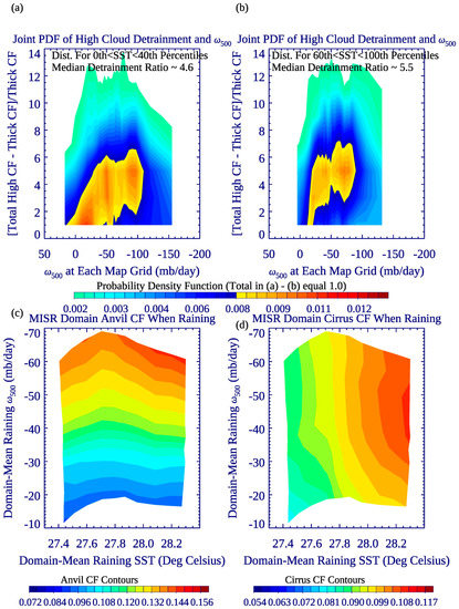 (a) Joint PDF of high cloud detrainment ratio and ω500 for the first two TWP SST quintiles, collected from the 1° × 1° time-averaged raining map grids during the large-scale SST conditions. Detrainment ratio is estimated from (2) in the text. (b) Same as (a), except for the upper two TWP SST quintiles. (c) Domain-averaged anvil CF versus 100 bins of mean raining (TWP SST, ω500). (d) Same as (c), except for domain-averaged cirrus CF.
