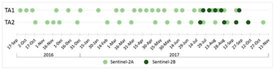 Timeline of the two satellite image time series (SITS) used, composed of Sentinel-2A and 2B images with an irregular temporal distribution.