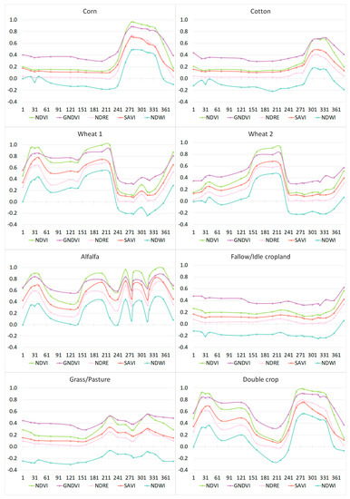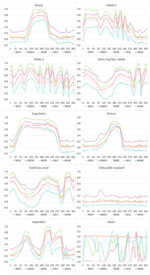 The temporal patterns of the classes analyzed for TA1, with values of five vegetation indices shown on the vertical axis. We analyzed a single agricultural year, the horizontal axis shows the day-of-the-time-series, namely from 23 September 2016 to 23 September 2017 (365 days). Two temporal patterns were identified for alfalfa (1 and 2). The vegetation indices are the Normalized Difference Vegetation Index (NDVI), Green Normalized Difference Vegetation Index (GNDVI), Normalized Difference Red-Edge (NDRE), Soil Adjusted Vegetation Index (SAVI), and Normalized Difference Water Index (NDWI), derived as shown in Table 1.