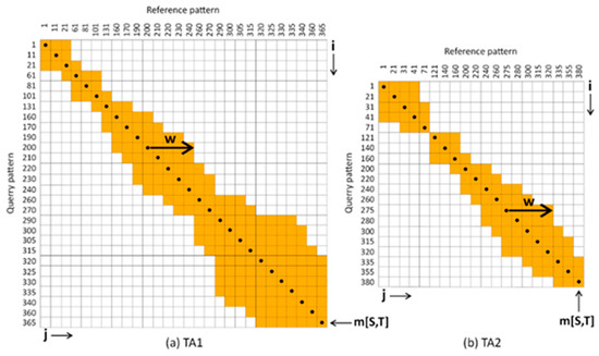 Two special cases may arise when choosing the time-constraint on the warping path. First, when w = 0 the computation is limited to the diagonal elements, resembling the Euclidean distance. Second, when w is higher than the temporal length of the longest sequence the entire DTW matrix is computed. Therefore, the value of w needs to be adjusted to the characteristics of SITS analyzed to make sure that a warping path exists [11]. The procedure of computing a time-constrained DTW is described in Algorithm 1. Examples of two DTW matrices for TA1 and TA2 with 45-day time-constraints are depicted in Figure 7.