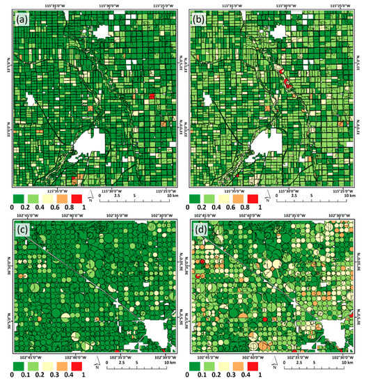 Test area locations in California (first test area (TA1)) (a) and Texas (second test area (TA2)) (b). The false color composites for TA1 (1 May 2017) and TA2 (20 July 2017) are depicted in (c) and (d), respectively.
