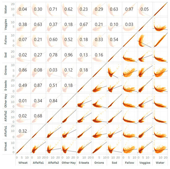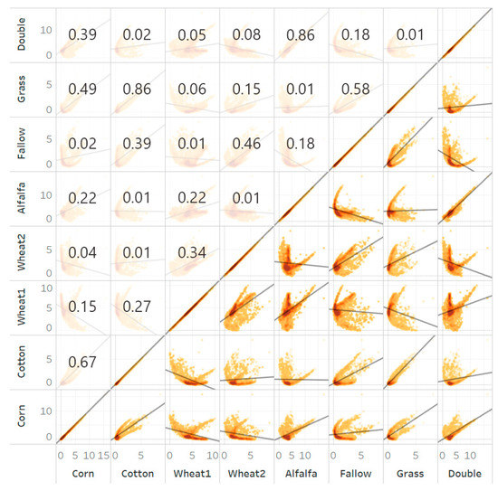 Various studies addressed the issues of evaluating the accuracy measures of maps, with descriptions, advantages, limitations, or extensions, offering suggestions for an efficient and objective use within studies [67,68]. In this study, we use the error matrix and its related accuracy measures, namely the producer’s (PA) and user’s accuracy (UA) and overall accuracy (OA) [69]. Furthermore, we acknowledge the fact that using reference and validation samples from CropScape may introduce additional errors in the classifications. We compared our PAs, UAs, and OAs in conjunction with those available from CropScape for individual crops, at the state level. Although we heavily altered the samples obtained from CropScape to better match the reality of our study areas, thus increasing the accuracy of the samples, we combined the errors from our analysis with the errors from CropScape by computing the square root of the sum of the two squared errors, in order to see the maximum potential errors for PAs, UAs, and OAs.