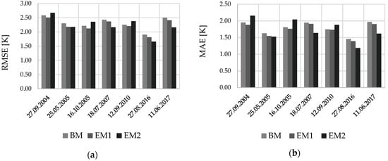 Considering the averaged global analysis, we achieved better results for BM with disaggregated MODIS LST than for the original datasets (Table 3). EM1 and EM2 yielded quite similar RMSE and MAE values, which indicates a reduced contribution of different variables incorporated in both LST sharpening methods. In contrast to the latter methods, RMSEmean (MAEmean) for basic modelling was equal to 2.31 K (1.79 K), which corresponded to accuracy improvement of 22% (18%) compared to statistics obtained for Landsat and the original MODIS (Table 3). The above-mentioned outcomes (Figure 3 and Figure 4) indicate that the proposed RF approaches gave quite similar LST spatial patterns.