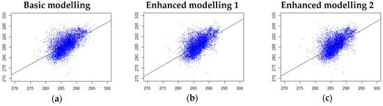 Regression performances differed depending on acquisition date. Apart from images acquired in September and October, we achieved a positive effect of enhanced modelling (EM1, EM2) on the accuracy results (Figure 3). The greatest errors appeared for the scenes from early autumn (27 September 2004) and from late spring (11 June 2017), with RMSE of about 2.6 K and 2.4 K, respectively. Such discrepancies, documented in Figure 3, may have occurred because of different periods of growing season, the limited number of samples and their small variability incorporated in the RF modelling. This is likely due to weather conditions during image acquisitions, with dense cloud cover and shadowed surfaces over the Alps. These factors influenced negatively the determination of the impact of biomass content and elevation in the prediction of land surface temperature spatial patterns.