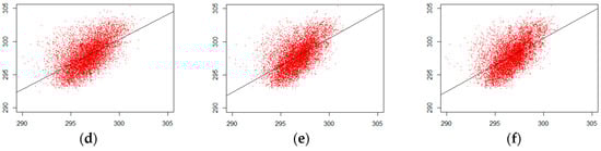 Scatterplots of the sharpened MODIS land surface temperature (LST) [K] [X-axis] versus Reference Image [K] [Y-axis] (degraded Landsat LST) for the applied RF models (BM, EM1, EM2). The top row shows results obtained on 27 September 2004 (a–c) and the lower line presents outcomes for 27 August 2016 (d–f).