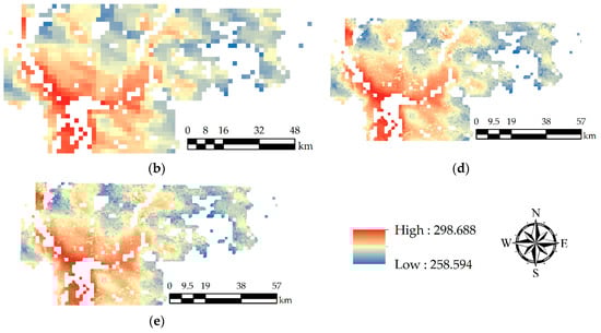 After applying smoothing Gaussian filtering and mean value cell area weighted resampling for upscaling, we calculated LST maps for the selected dates []. Landsat images used for the validation are summarized in Table 2.