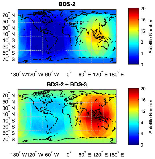 It can be observed from Figure 1 and Table 1 that for BDS-2 constellation, the maximum visible satellite number is about 13.8, which is located in Southeast Asia, where the equatorial region is at the longitude of about 110°. For the opposite part of the Earth, i.e., the Americas, the average satellite number would less than 4, which is challenging for PNT service. With the contribution of BDS-3 satellites, Southeast Asia would still be the “hottest” area of BDS, with 20 satellites that can be tracked at most. As for the Americas, a minimum number of 5.7 satellites is visible, which indicates that a global PNT service is possible using the current BDS-2 and BDS-3 constellation. Comparing with BDS-2, the global average visible satellite number increases from 5.1 to 10.7.