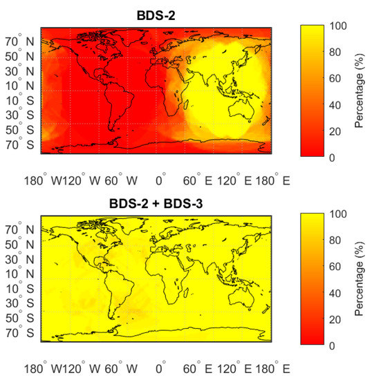PDOP availability (PDOP < 6) for BDS-2 (upper) and BDS-2+BDS-3 (lower) for an elevation angle mask of 10° on 1 January 2019.
