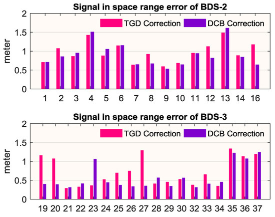 From Table 2 we can see that the overall SISRE of the current BDS constellation is 0.83 m (TGD correction) or 0.71 m (DCB correction). For BDS-2, the SISRE is within 1 m, which shows a similar performance as reported in Montenbruck et al. [24]. For BDS-3, with the contribution of a more stable satellite clock and a new ISL technique, SISRE of BDS-3 is superior to BDS-2, where the average SISRE is 0.71 m versus 0.96 m after TGD correction. If DCB correction is applied, the average SISRE is 0.57 m versus 0.90 m, respectively, which indicates that the TGD accuracy of BDS-2 is similar to DCB, while the TGD accuracy for BDS-3 is slightly worse. As it can be seen from the lower subplot of Figure 4, some satellites show an obvious poor SISRE after TGD correction. This may be due to the accuracy of the TGD on these satellites. Meanwhile, it is interesting that the SISRE of C35-C37 are apparently worse than other BDS-3 satellites. As reported by Deng [30], receivers able to track C35~C37 are much less than other BDS-3 satellites, which would lead to lower accuracy of precise orbit and clocks for C35-C37. If C35-C37 are excluded, SISRE of BDS-3 would reduce to 0.62 m (TGD correction) or 0.45 m (DCB correction), which is at the similar level of GPS and Galileo.