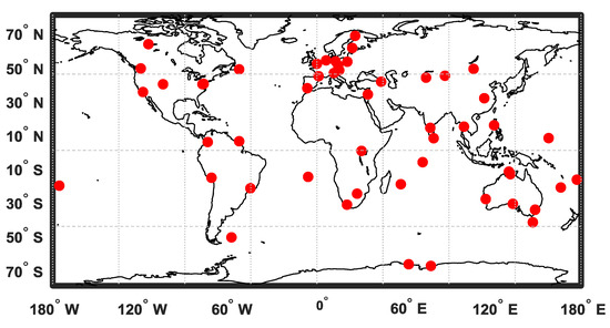 As a volunteer association, the International GNSS Service (IGS) continuously provides multi-GNSS data and products [31]. For the validation of positioning, 54 globally distributed IGS stations are selected, as shown in Figure 5. These stations are equipped with JAVAD or SEPTENTRIO receivers, which are able to receive BDS signals B1I, B2I and B3I. Among JAVAD receivers, some firmware versions of JAVAD TRE_3 and JAVAD TRE_3 DELTA are able to receive new B1c and B2a BDS signals.