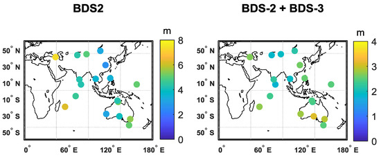 To investigate the benefit of BDS-3, 20 out of 54 stations around the Asia-Pacific and Indian Ocean region are selected and compared with BDS-2-only SPP performance. An average of 7-day 3D RMS results for BDS-2-only and BDS-2+BDS-3 are illustrated in Figure 7. A statistical result in RMS and 95% accumulated error are listed in Table 4. It is obvious to see the advantage of BDS-3 in improving horizontal and vertical accuracy. Comparing with global performance in Table 3, the horizontal accuracy is slightly better in the service area of BDS-2, as more satellites are visible. As BDS-2 performance decreases dramatically beyond the center of the Asia-Pacific region, the contribution of BDS-3 would be more obvious in these regions. What is more, it is interesting to find that for the BDS-2-only case, the positioning accuracy in the North-South component is better than the East-West component, while it is opposite for the BDS-2+BDS-3 or GPS case. This may be due to the reason that 5 GEO satellites of the BDS-2 are located over the equator at longitude of 58.75°E, 80°E, 110.5°E, 140°E and 160°E respectively, which would contribute to the DOP value in the North-East component. When BDS-3 satellites are included with a better SISRE, this kind of GEO contribution would decrease.