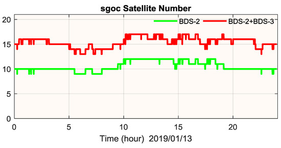 Furthermore, to have a specific observation of the contribution of BDS-3, we take one of the stations, SGOC (6.89°N, 79.87°E) as an example. Figure 8 depicts the visible satellite number on January 13, 2019. The average satellite number increases from 10.6 to 15.5 with the help of BDS-3, which would definitely contribute to positioning performance. The corresponding RMS of the SPP result, as shown in Figure 9, would improve from [0.93 m, 1.35 m, 1.82 m] to [0.69 m, 1.11 m, 1.68 m] in the North-East-Up component with a smaller positioning noise due to better PDOP and smaller SISRE of the BDS-3 satellites.