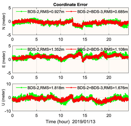 RTK performance of BDS-2-only and BDS-2+BDS-3 scenarios at these two baselines are depicted in Figure 15 and Figure 16, together with the statistical results of RMS and 95% accumulated error listed in Table 6. This illustrates that BDS-3 contributes to a more stable and precise RTK performance in the horizontal and vertical component, with a 1~2 mm improvement for 20 m baseline and 1~2 cm improvement for the 10 km baseline. Although it is not shown here, it should be pointed out that if we perform instantaneous RTK at the 10 km baseline [33], it would lead to some wrong ambiguity fixing for the BDS-2-only case.