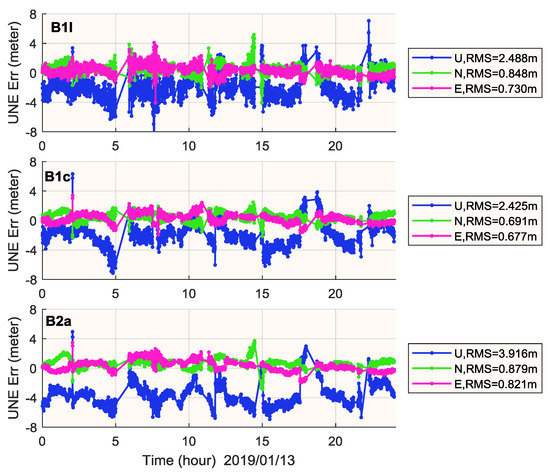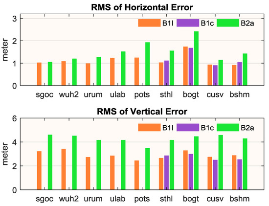 RMS of SPP performance of B1I, B1c and B2a at horizontal (upper) and vertical (lower) component (BDS-3-only, one week).