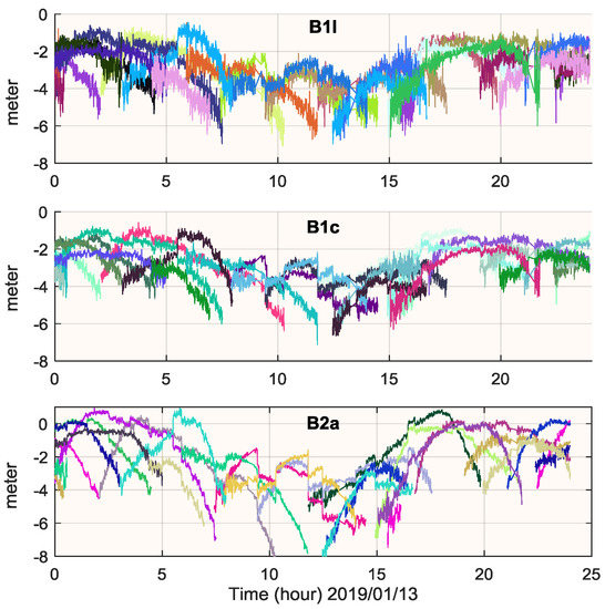 Daily SPP performance of B1I, B1c and B2a at station BSHM are evaluated, as shown in Figure 12. Similar conclusion can be found that B1I and B1c performs a similar positioning accuracy, while it is much worse on B2a. Furthermore, it seems that positioning error dispersion on B1I is much noisier than B1c and B2a. To validate it, the pre-fit observation minus corrections (OMC) of B1I, B1c and B2a are calculated using true coordinates, which are illustrated in Figure 13. Obviously, the OMC noise on B1c and B2a is much smaller than B1I. This is different from the BDS-3e satellite, whose B1c noise is at the same level as B1I [15]. However, although the B2a signal performs the smallest noise, the OMC on B2a shows a much more dispersive residual, thus resulting in the worst positioning error. This may be due to the inaccurate model of ionosphere correction, which has a more serious impact on B2a rather than B1I or B1c.