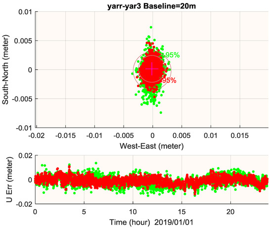 Twenty m baseline RTK performance in horizontal (upper) and vertical (lower) using BDS-2-only (green) and BDS-2+BDS-3 (red). The gray circle shows the 95% confidence level of horizontal error. Ambiguity fix percentage is 100% for both cases.