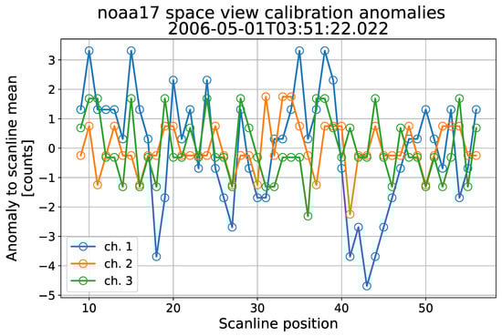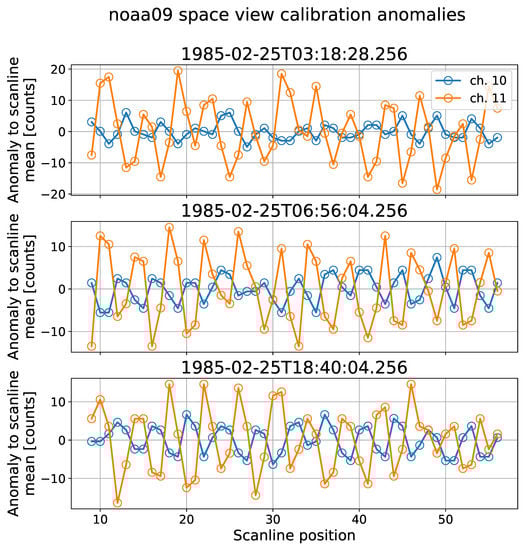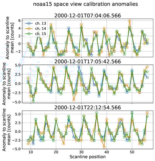 In reality, we observe that space view count deviations (see Equation (1)) may be uncorrelated (as expected), exhibit strong positive correlation, or even exhibit significant negative correlation. For example, Figure 1 shows a case where space view correlations are absent. It shows deviations for channels 6–8 for a single set of calibration measurements on NOAA-14. In contrast, Figure 2 shows an example of strong positive space view count deviations, in this case for channels 13–15 for three sets of calibration measurements on NOAA-15. Two features are immediately apparent from the figure: firstly, the deviations for the three channels are very highly correlated. Therefore, the deviations cannot be caused by white noise, but must be dominated by a shared physical mechanism. Since the measurements for different channels are not taken simultaneously, that mechanism must have some temporal persistence. That brings us to the second feature: the source causing the deviations is quasi-periodic with a period of around 0.5 s. Finally, Figure 3 shows an example where correlations are negative, apparently due to periodic error affecting both channels, but lagging by half a phase in channel 11 compared to channel 10. Negative correlations are less common than positive, but are not exceptional in the HIRS record.