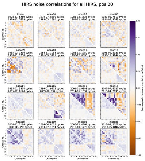 To describe more compactly for what satellites and channel pairs correlations of either sign occur, we calculate the Pearson product-moment correlation according to Equation (2). To account for possible time variations, we do so both early and late within each satellites lifetime. Figure 4 shows the correlations between the error of 20 channels for each instrument on HIRS, for one month early and one month late in each sensor’s lifetime (the diagonal is set to zero, as a reminder that this is not a normal correlation matrix, that there is no information here, and to clearly visually separate the two relevant triangles). This is an evaluation of Equation (2) with v referring to space views, view (chosen arbitrarily), and the number of sets of calibration views according to the numbers shown above each panel. The number of views varies due to data availability and filtering. Note that, for all sensors, there are strong correlations between channels using the same detector and at the same radial distance from the filter wheel central axis, as can be seen by the blocks corresponding to channels 1–12 (HgCdTe detector, smaller radial distance on filter wheel) and 13–19 (InSb detector, larger radial distance on filter wheel). Most sensors have error correlations between channels with different detectors as well, apart from channel 20 (visible, Si detector) where the error is mostly uncorrelated with error in other channels, except during September 2009 for NOAA-15. Correlations can be both positive or negative. Note that an absence of a correlation can either mean that there really is no correlation, or that periods of positive and negative correlation cancel out over the period considered. In many cases (e.g., NOAA-16), correlations within the same detector (and radial distance on filter wheel) are mostly positive, while correlations between channels for different detectors (and different radial distances on filter wheel) take both signs.