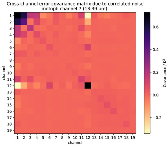To illustrate how such correlations may propagate to covariances, Figure 5 shows an error covariance matrix for Metop-B channel 7, calculated over a 10 min period on 27 February 2016. This is a variation of a figure published in [], which explains the mathematics on calculating covariances from correlations using uncertainties and sensitivity coefficients. The figure is less illustrative than correlation matrices, because the scale is dominated by channels with high radiometric noise, but covariances are more directly applicable in many applications.
