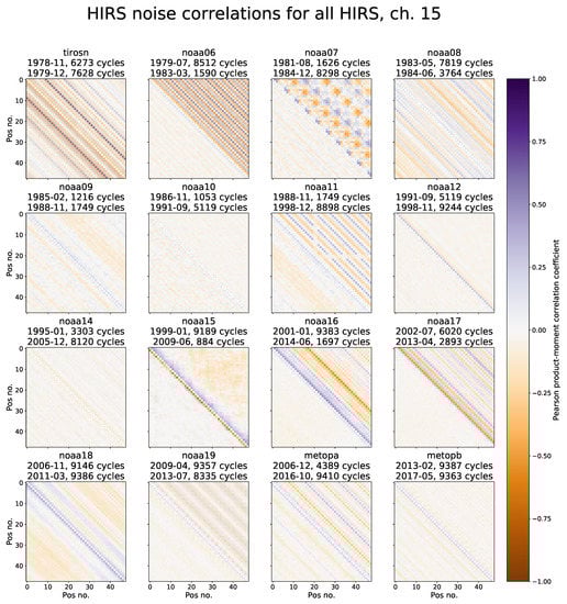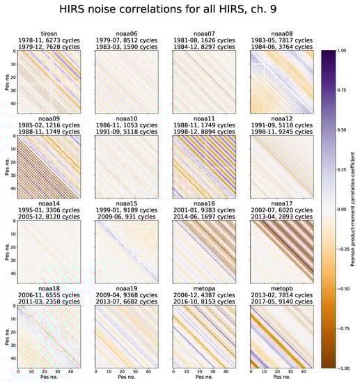 An example is shown in Figure 7, which shows the Pearson product-moment correlation between the error of 48 space views on longwave channel 9 (9.71 μm), using the HgCdTe detector (see Equation (3)). Note that the number of valid views per satellite and month here may differ from the ones in Figure 4, because calculating inter-channel correlations requires all channels to have valid measurements, whereas calculating inter-position correlations for a particular channel only requires that channel to have valid measurements. The figure shows that the periodicity in counts error illustrated in Figure 2 is prominent in many satellites, namely those cases where regular diagonal striping is evident. For Channel 9 on NOAA-6, -7, -10, and -14, view error correlation appears weak or absent. However, if there is periodic error for which the period or phase changes within the time for which the correlation matrices were calculated, the effects may average out. Therefore, absence of evidence in Figure 7 does not imply evidence of absence of periodic error. In NOAA-12, -15, and -17, there is little to no evidence for correlation at the beginning of the mission, but marked correlation is present toward the end. On TIROS-N; NOAA-8, -9, -11, and -16; and MetOp-B, both periods show correlations, but period and magnitude vary. NOAA-18 and -19, and MetOp-A show similar behaviour for both periods shown. Other longwave channels show similar behaviour (not shown).