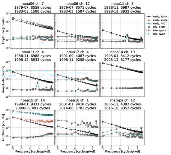 which refers to the th absolute coefficient of the Fourier transform corresponding to view v (space, IWCT, or Earth) for channel c. Space and IWCT views should ideally be constant with white noise, so even a weak periodic error will be easily detectable. The signal in Earth views should be expected to vary significantly in space and time on all scales (with channel-dependent characteristics) and follow a power law distribution []. The comparison of the Fourier transform between calibration and Earth views can tell us if we should expect the periodic error to be significant in comparison with the natural variability of the atmosphere.
