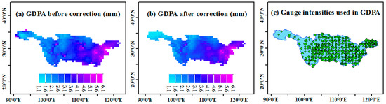 The gridded daily gauge-based precipitation analysis (GDPA) product, developed by NMIC-CMA, across the Yangtze River basin during the same period of IMERG-E was employed in this study and used for adjusting the SPE in bias correction and for the reference dataset. The gridded dataset was generated at a 0.5° × 0.5° spatial resolution using climatological optimal interpolation based on more than 2000 national rain gauges [44,45]. Before the interpolation was implemented, the gauge data underwent a thorough quality check, including an extreme value check and internal consistency, while after the interpolation, orographic errors contained in the GDPA were corrected to maintain spatial consistency [46]. In addition, systematical validation of GDPA revealed that this daily product remained in good agreement with the observations over different regions of China and bias between the values of 0.5° grid cells and the individual gauge observations were lower than 3.21% [47]. The spatial distributions of the daily averaged ground precipitation, GDPA, before and after correction are presented in Figure 2a,b for comparison. In addition, the locations of the rainfall gauges used in the optimal interpolation of GDPA are displayed in Figure 2c. The change of correction mainly focused on the boundary of the western area in the Yangtze River basin. GDPA was frequently used as the benchmark for satellite precipitation evaluation in both statistical and hydrologic assessments, due to its high quality [48,49]. There were about 650 grid boxes at 0.5° × 0.5°, with at least one rain gauge per grid box over the entire basin.