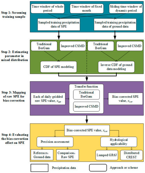It is assumed that the bias of SPE to be corrected in this study is constrained to the systematic bias resulting from, for instance, inaccurate measurement of the satellite sensor and noisy retrieval of the inversion algorithm. As the mainstream of bias correction, distribution mapping is frequently explored. The implementation of distribution mapping-based bias correction depends on the transfer function, a mapping or a statistical relationship from the biased SPE to observations. Whether the transfer function is skillful determines the efficiency of the bias correction. Therefore, the focus of the bias correction is to develop an available and powerful transfer function.
