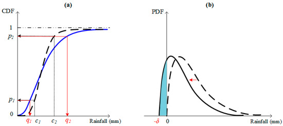 The schematic diagram of (a) transfer function of distribution mapping used in bias correction, and (b) the censored shifted change of parametric statistical distribution.