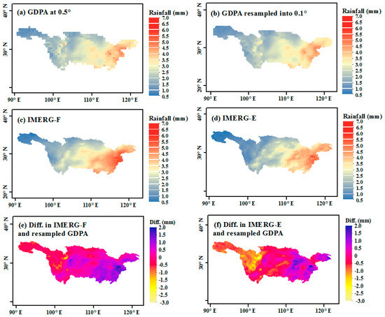 Spatial distribution of average daily (a) ground gridded reference precipitation, GDPA at raw 0.5° spatial resolution, (b) GDPA resampled at 0.1° spatial resolution, (c) “Final” post-real-time satellite precipitation estimates, IMERG-F, (d) raw “Early” near-real-time satellite precipitation estimates, IMERG-E selected to bias correct in this study, (e) difference (Diff.) between IMERG-F and resampled GDPA, and (f) Diff. between IMERG-E and resampled GDPA.