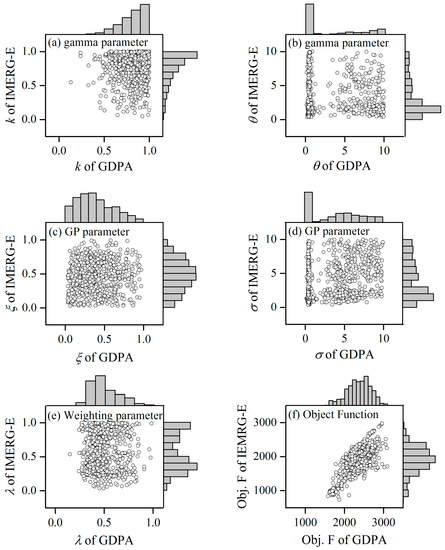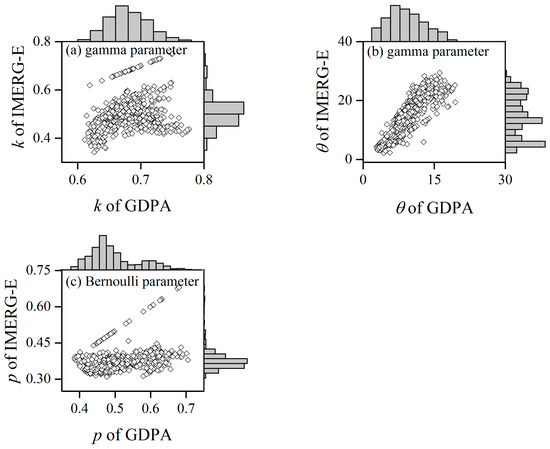 For SPE to be corrected, given the definition of the transfer function of distribution mapping, the important procedure is to estimate the parameter sets in the transfer function of traditional BerGam and improved CSMD (see Step 2 of Figure 3). Figure 6 displays the scatters and histograms of each optimal parameter of BerGam estimated for IMERG-E and corresponding GDPA data at all grids in the basin. Figure 6 depicts the estimation range and degree of aggregation for each parameter over all grids. For example, IMERG-E showed smaller shape parameter k and higher scale parameter in gamma distribution, and smaller p parameter in Bernoulli distribution at most grids.