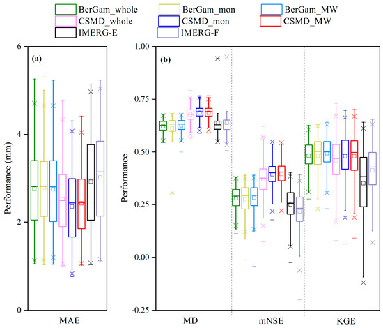 To statistically quantify the bias correction effect on IMERG-E from multiple aspects, the performance of bias-corrected IMERG-E using CSMD and BerGam methods was represented by the metrics of MAE, MD, mNSE, and KGE mentioned above. These four indexes present an integrated understanding of the difference in IMERG against GDPA from relative/absolute residual errors to comprehensive evaluation. Figure 8 presents the boxplots of these metrics calculated in each grid. It could be clearly observed that either improved CSMD correction or traditional BerGam correction reduced the discrepancy of raw satellite precipitation and ground analysis and significantly enhanced the precision of the precipitation series at most grids. In addition, the corrected IMERG-E via CSMD mapping approach as a transfer function generally performed better than that via traditional BerGam mapping. Specifically, the mean and quartile MAE values of IMERG-E corrected by CSMD were much lower compared to the corresponding values of BerGam. For example, the means of MAE for CSMD- and BerGam-corrected IMERG were 2.35–2.52 mm and 2.75–2.79 mm among three time-window schemes respectively, while the median values of MAE for CSMD- and BerGam-corrected IMERG-E were around 2.45 mm and 2.81 mm, respectively. Similarly, the CSMD-corrected IMERG-E was superior to the BerGam-corrected IMERG-E in terms of MD and mNSE metrics. As for IMERG-E, the KGE exhibited unsatisfying results with values lower than 0.1, even negative, mainly over the northwest part of the basin. For KGE, an index of comprehensive assessment, the CSMD correction performs comparatively well overall with BerGam, with the exceptional case of taking the whole period as a time window. The CSMD-corrected IMERG-E outperformed BerGam-corrected IMERG-E in metrics of MAE, MD, and mNSE, while performing comparatively with BerGam-corrected IMERG-E in terms of the KGE metric. This is associated with the different emphases of the four metrics, that MAE, MD, and mNSE aim at the quantification of deviation between each pair of two input precipitation series and KGE aims at a relationship of the whole trend between the two series. These results suggested that the improvement of the CSMD correction to IMERG-E was mainly concentrated on the reduction of deviation of the biased raw IMERG-E to the reference data. As a comparator of IMERG-E, the post-real-time IMERG-F data performed better than the raw IMERG-E towards MD and KGE metrics, while performing worse than IMERG-E towards MAE and mNSE metrics. On the other hand, both the BerGam-corrected and CSMD-corrected IMERG-E performed much better than IMERG-F towards all four metrics, shown in Figure 8. These results indicated that not only the precision of corrected IMERG-E using BerGam and CSMD was higher than the raw IMERG-E, but also the effect that bias correction exerted on the IMERG-E surpassed the post-processing of IMERG-F by merging monthly GPCC gauge data.