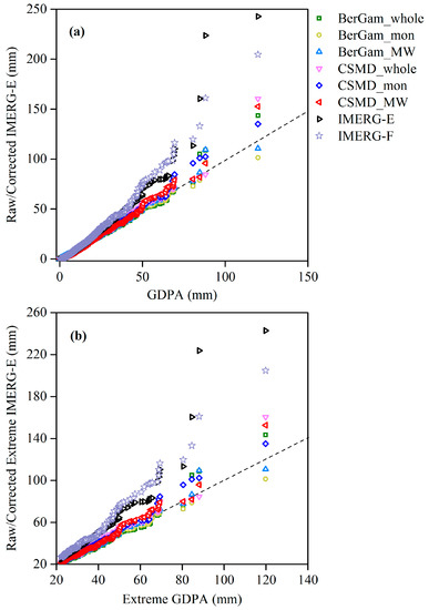 The extremely high precipitation is one of the focuses in precipitation bias correction using distribution mapping due to the extremely low probability of high values located in the tail of the distribution (see Figure 4b). Therefore, the effect of bias correction on extreme precipitation attracted particular attention. The Q-Q plot of extremely high precipitation (greater than 97.5% quantile with threshold values ranging from 20.68–24.55 mm) for raw and corrected IMERG-E against the corresponding extreme GDPA data was displayed in Figure 9b. For the extreme part of corrected precipitation, the CSMD correction using the sliding window scheme generally obtained best-fitness with the GDPA data, followed by the CSMD correction using the whole time period window scheme. In addition to the Q-Q plot, the empirical CDF of precipitation in Figure 10b, focusing on the change of CDF ranging 0.91–1, can also be used to analyze the goodness-of-fit for extreme precipitation correction. From the Figure 10b, it can be observed that the corrected IMERG-E curves, especially for the result associated with CSMD correction, keep well-consistent with the GDPA curve in the precipitation range of greater than about 20 mm/d, although the curves of BerGam-corrected IMERG-E series performed better than those of the CSMD correction in the range of 13–20 mm/d. In summary, the result in Figure 10b demonstrated that the CSMD correction is more skillful in correction the extremely high precipitation intensities.