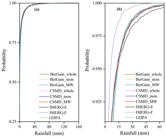 Cumulative probability distribution (CDF) of all precipitation datasets used, including the raw and corrected satellite precipitation IMERG-E, the post-real-time IMERG-F and the ground reference precipitation GDPA. (a) Over all intensities of the precipitation series, and (b) over relatively high intensities of precipitation series with their corresponding CDF values of 0.91–1.