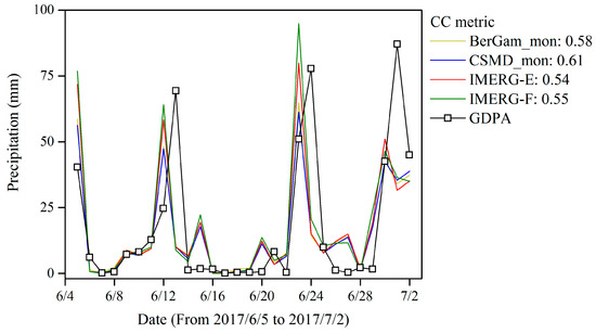 Performance of two bias-correction approaches on satellite precipitation IMERG-E in a summer heavy rainfall event during 5 June 2017–2 July 2017. Values of Correlation Coefficient (CC) metric between the raw IMERG-E, bias-corrected IMERG-E, and IMERG-F against GDPA were displayed in the legend. To ensure the lines are clearly observed, only the monthly time window scheme in each bias correction approach (with best performance among three time-window schemes in each approach), i.e., BerGam_mon and CSMD_mon, was used to exhibit here.