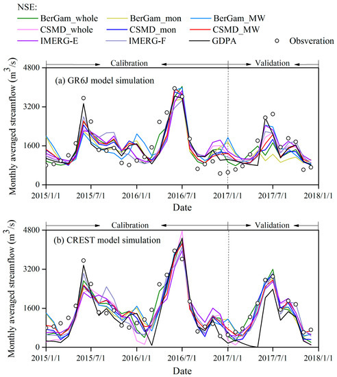 The streamflow simulation of Wulong station at the outlet of Wujiang River basin individually via the lumped GR6J and distributed CREST forced by nine precipitation inputs including one raw and six bias-corrected IMERG-E precipitation, post-real-time IMERG-F, and one ground reference GDPA during 1 April 2014–31 December 2017 was evaluated. Figure 12 presents the monthly-accumulated hydrographs of the simulated streamflow. The summary of NSE, r, and RD metrics between simulated streamflow and observed streamflow in calibration and validation periods was listed in Table 3. NSE and RD were used to quantify the deviation of SPE from GDPA, while r was used to depict the global correlation between SPE and GPDA. Although there existed no completely uniform pattern of streamflow simulation precision in BerGam and CSMD, the streamflow simulation driven by CSMD-corrected IMERG-E outperformed that driven by BerGam-corrected IMERG-E in more cases of calibration and validation. Specifically, taking NSE for example, the simulated streamflow of GR6J driven by BerGam deteriorated in validation period (NSE ranging in −0.15–0.40) even obtained useless results with negative NSE in the case of BerGam_mon, although it performed well in the calibration period (NSE ranging from 0.47–0.62). The performance of rainfall-runoff modeling via GR6J in both the calibration and validation periods was acceptable with NSE ranging from 0.51–0.56 and from 0.35–0.51, respectively. Similarly, with GR6J, the performance of CSMD-driven streamflow simulation via CREST in the validation period, as indicated by the NSE index, was overall better than that of the BerGam-driven results (0.62–0.74 versus 0.66–0.68 for the CSMD and BerGam correction respectively), indicating the higher prediction capability of CSMD relative to BerGam. The modeling precision associated with IMERG-F was overall slightly lower than that with CSMD-MW, which performed best among all nine precipitation inputs. Furthermore, the simulation of CREST obtained better performance than that of GR6J, and the unreliable modeling with negative NSE values occurred in GR6J, demonstrating that the distributed CREST model was more robust than the lumped GR6J in this study. If it is assumed that higher performance (shadowed numbers in Table 3) of two or three metrics among NSE, r, and RD appeared in the same model running, then the conclusion is the same with the evaluation using NSE only, although the order of r or RD was not completely the same as ranked NSE in the shadow grids of Table 3. In general, the hydrological effect that the CSMD correction exerted on IMERG-E driving GR6J and CREST rainfall-runoff modeling outperformed that of the BerGam correction.