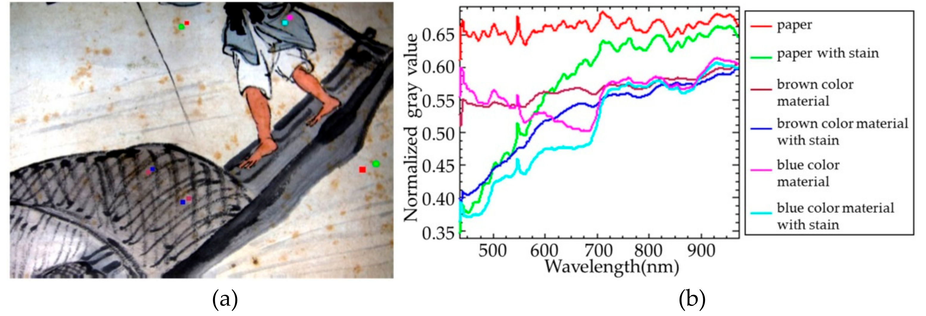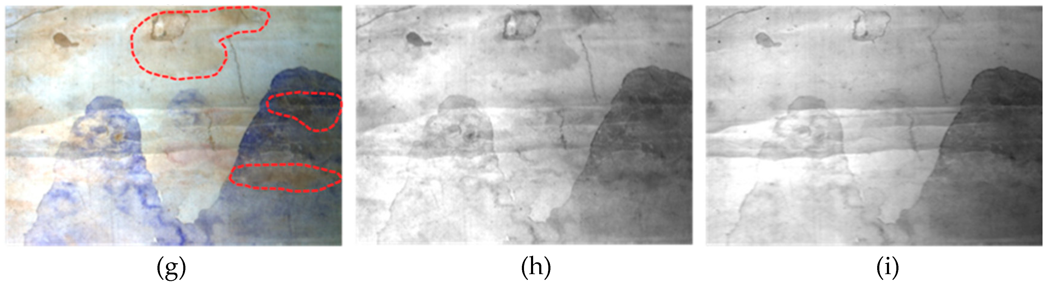 - Hou, M.; Zhou, P.; Lv, S.; Hu, Y.; Zhao, X.; Wu, W.; He, H.; Li, S.; Tan, L. Virtual restoration of stains on ancient paintings with maximum noise fraction transformation based on the hyperspectral imaging. J. Cult. Herit. 2018, 34, 136–144. [Google Scholar] [CrossRef]
