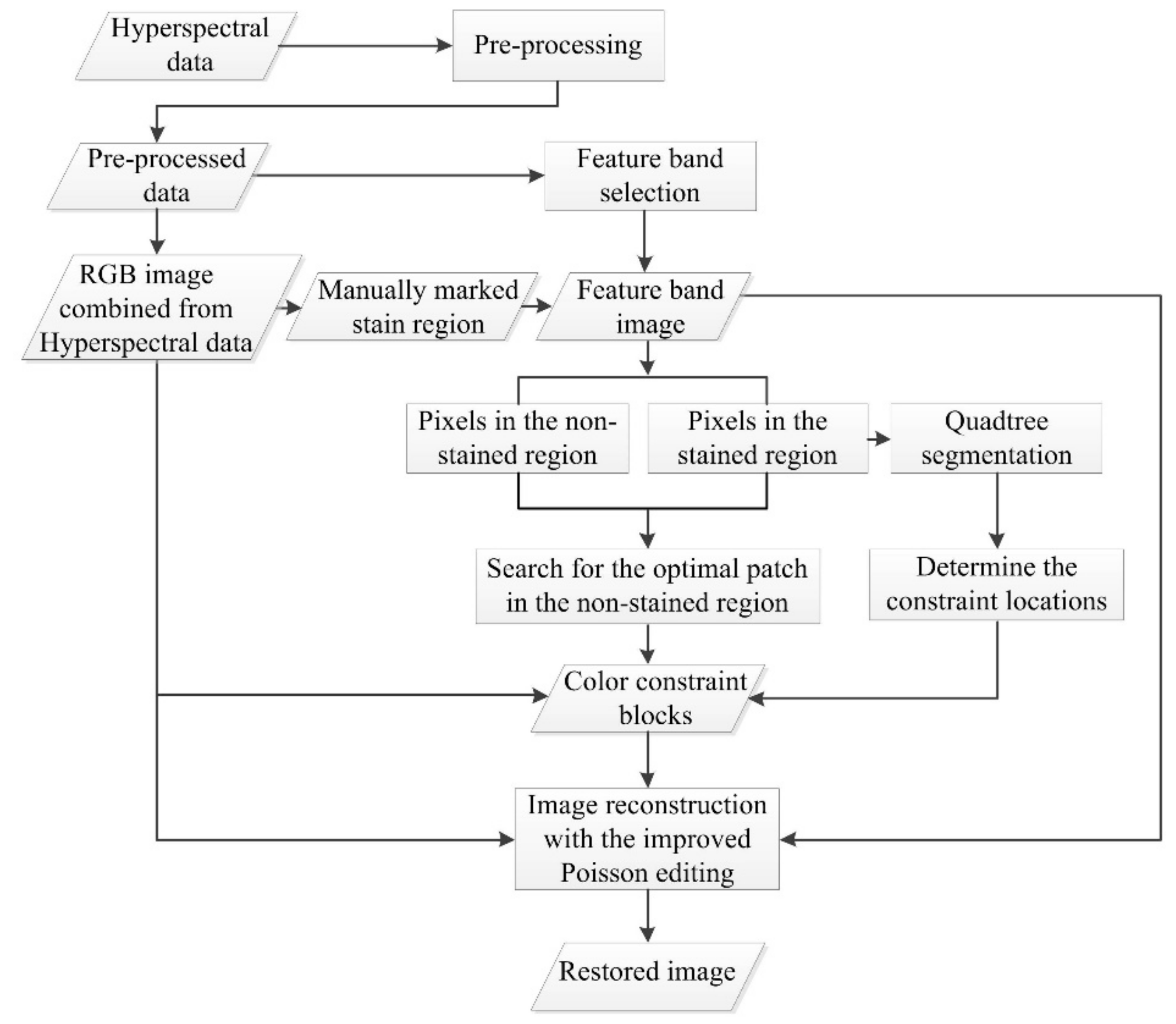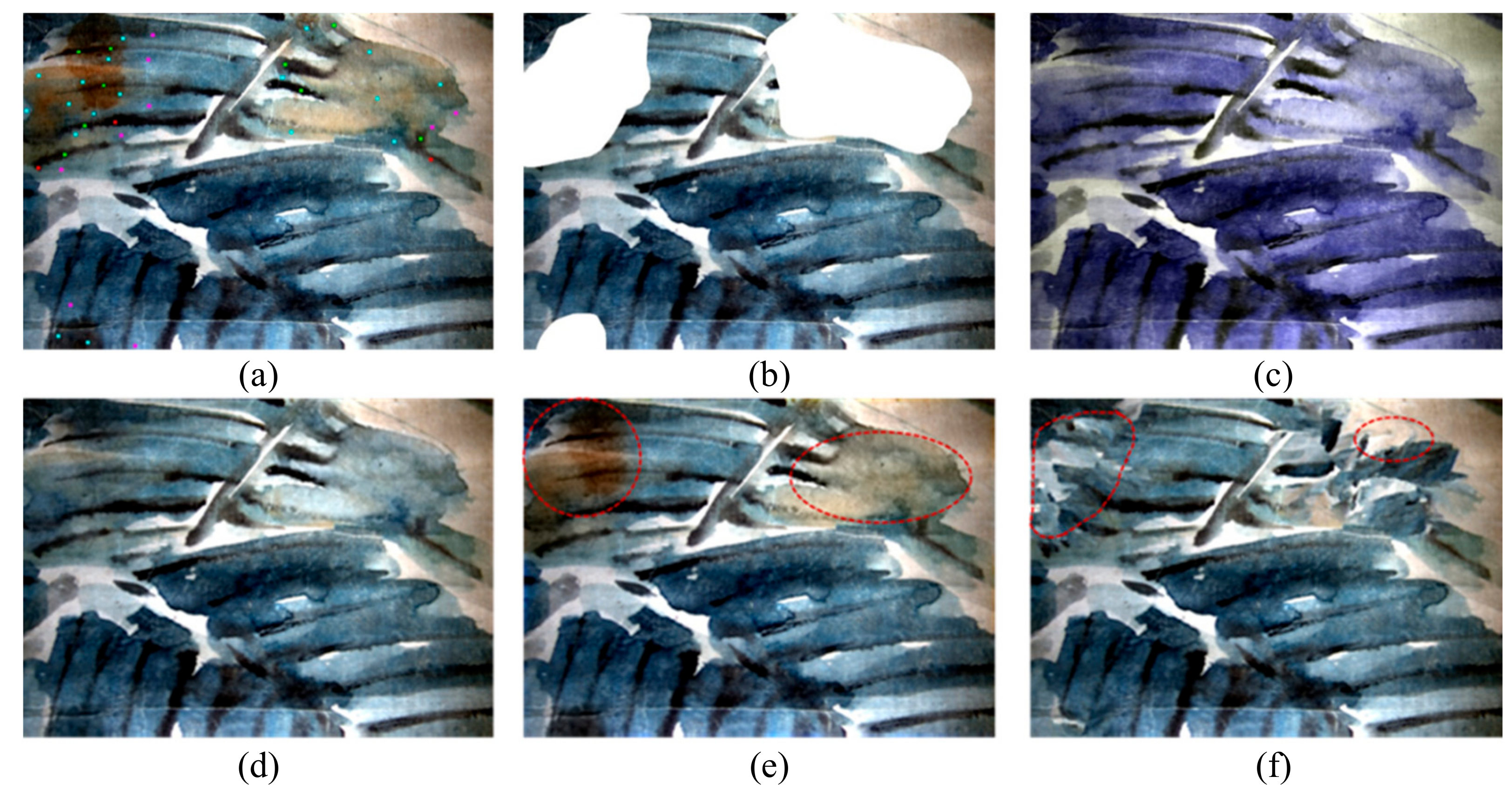 Zhou, P.; Hou, M.; Lv, S.; Zhao, X.; Wu, W. Virtual Restoration of Stained Chinese Paintings Using Patch-Based Color Constrained Poisson Editing with Selected Hyperspectral Feature Bands. Remote Sens. 2019, 11, 1384. https://doi.org/10.3390/rs11111384